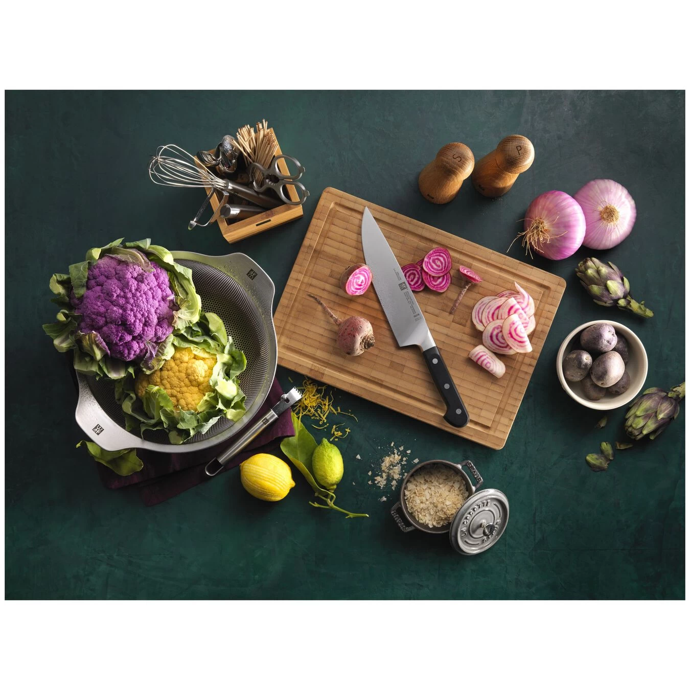 Spitzenklasse modern interpretiert: Diese geschmiedeten Premium-Messer im Nietendesign haben einen von Stardesignern Matteo Thun und Antonio Rodriguez schlank gestalteten Kropf (zwischen Griff und Klinge), der Ästhetik und Performance verbindet. Wenn du hohe Erwartungen an deine Küchenmesser hast, liegst du mit diesem hochwertigen Messer genau richtig und kannst dich auf Qualität, Schärfe und ergonomisches Design freuen. Dieses Kochmesser ist ein wahres Allzweck-Messer – Fisch, Fleisch, Geflügel oder Gemüse lassen sich damit mühelos schneiden. Der fugenlos verarbeitete Griff aus Kunststoff ist ergonomisch geformt, sodass das Küchenmesser besonders angenehm in der Hand liegt. Der V-Edge-Abzug der Schneide erfolgt in drei Schritten und sorgt für langanhaltende Schärfe und bietet eine dauerhaft hohe und präzise Schneidleistung, dank der du auch festes Schneidgut mühelos zerteilst. Die eisgehärtete FRIODUR Klinge überzeugt mit hoher Schneidhaltigkeit bei gleichzeitiger Flexibilität. Dieses Messer wurde in Deutschland gefertigt.